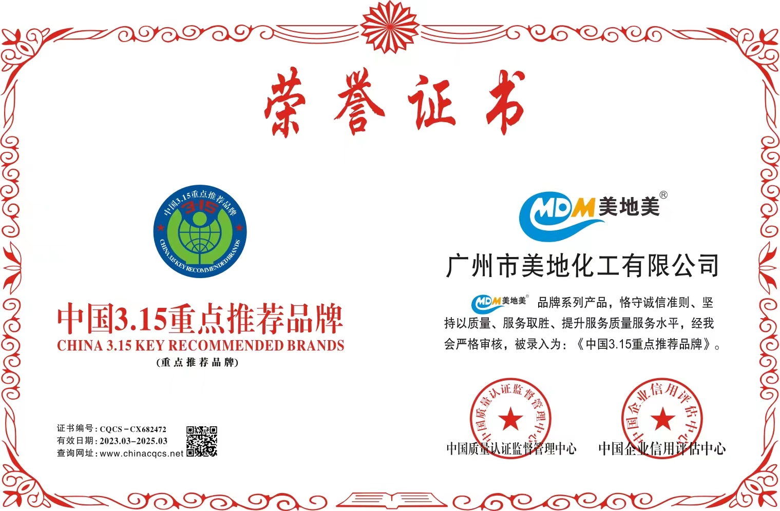 美地美地坪漆品牌系列產品,恪守誠信準則、堅持以質量、服務取勝、提升質量服務水平,已經被評為中國3.15重點推薦品牌,查詢網址:www.chinacqcs.net,證書編號:CQCS-CX682472。